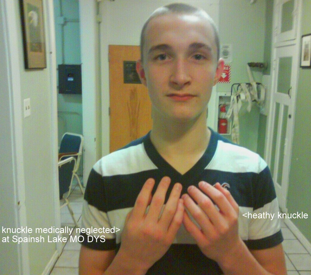 For more than seven months Spanish Lake deprives Keenan of surgical correction to his right hand. His right index knuckle disfigured, gimp hand, and is offset about an inch. His right index finger hangs from his offset knuckle and shakes like putty and his finger is now shorter. The youth is right-handed and does not have full range of motion and strength. The joint lacks 10-15 degrees of extension and is unable to make a fist. He claims it is still tender and painful.