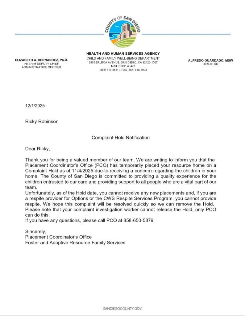 Not a single sentence in this letter addresses the only question that matters: Where are Malaika and Xayah, and why have they still not been returned to their family? Instead, this notice — signed off by both Hernandez and Guardado — reads like yet another calculated maneuver in a long pattern of retaliation, obstruction, and family destruction. With the County under public scrutiny, a documentary circulating, and Board of Supervisors members already walking out during accountability speeches, the timing of this hold is impossible to ignore. What San Diego County is doing here is not child welfare — it is child trafficking in broad daylight, carried out through paperwork, intimidation, and bureaucratic cruelty.