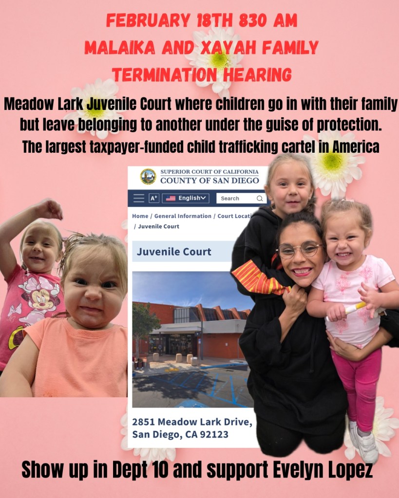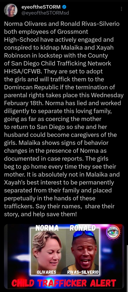 #MalaikaAndZayahRobinson #StateSponsoredKidnapping #NeverInAmerica #childtrafficking #CountyofSanDiego -complicit in crimes against families.
