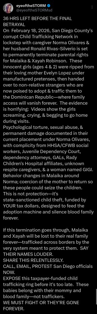 The County of San Diego’s Child Trafficking Network is going to terminate parental rights and set a proceeding to adopt the girls out February 18th, 2026.