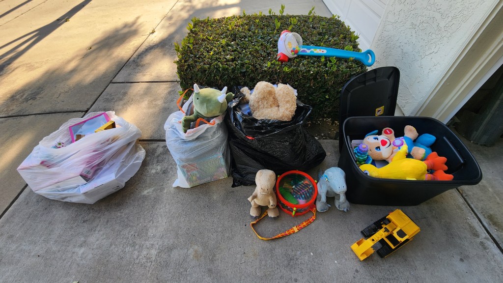 I responded with the raise of my right hand and the click of my heels chanting Heil Hilter Heil Milter as I walked away from the devils den as so ordered with full dignity. I waited for my daughter-in-law who is severely being punished by CPS psychopaths as she carried out the useless bag of toys herself. They are the sack of toys on far left in the photo above.